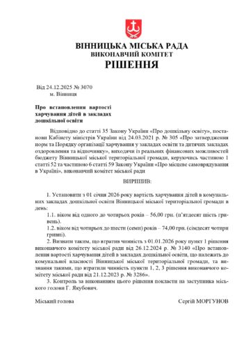 2. Визнати таким, що втратив чинність з 01.01.2026 року пункт 1 рішення виконавчого комітету міської ради від 26.12.2024 р. № 3140 «Про встановлення вартості харчування дітей в закладах дошкільної освіти, що належать до комунальної власності Вінницької міської територіальної громади, та визнання такими, що втратили чинність пункти 1, 2, 3 рішення виконавчого комітету міської ради від 21.12.2023 р. № 3286».